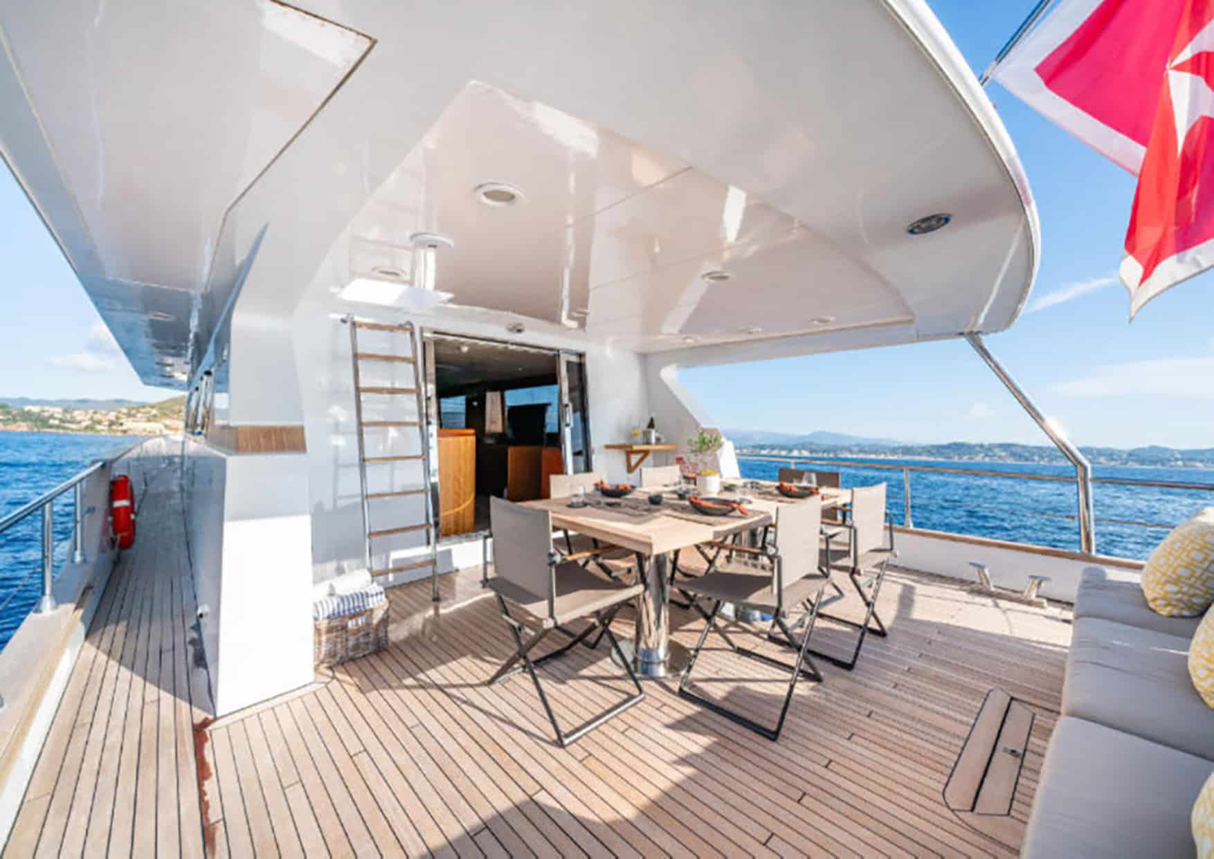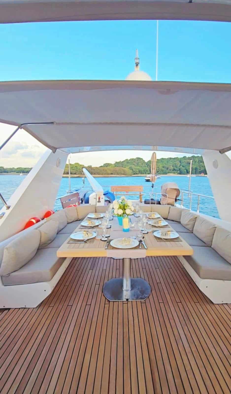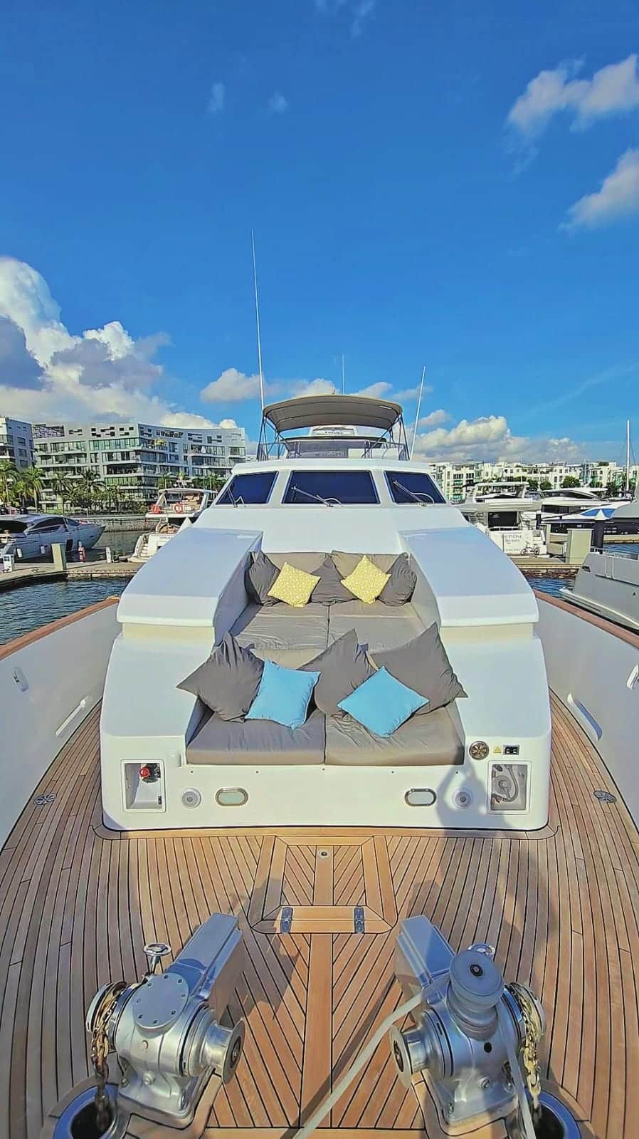 The yacht features wide open decks for socializing and relaxation. Its flybridge offers panoramic views and ample seating. Additionally, the upper deck includes generous lounging spaces for sun lovers. Guests can also enjoy the bow area, which provides a perfect spot for photos. The aft deck includes a shaded dining area for casual gatherings. Every outdoor section feels inviting and spacious.