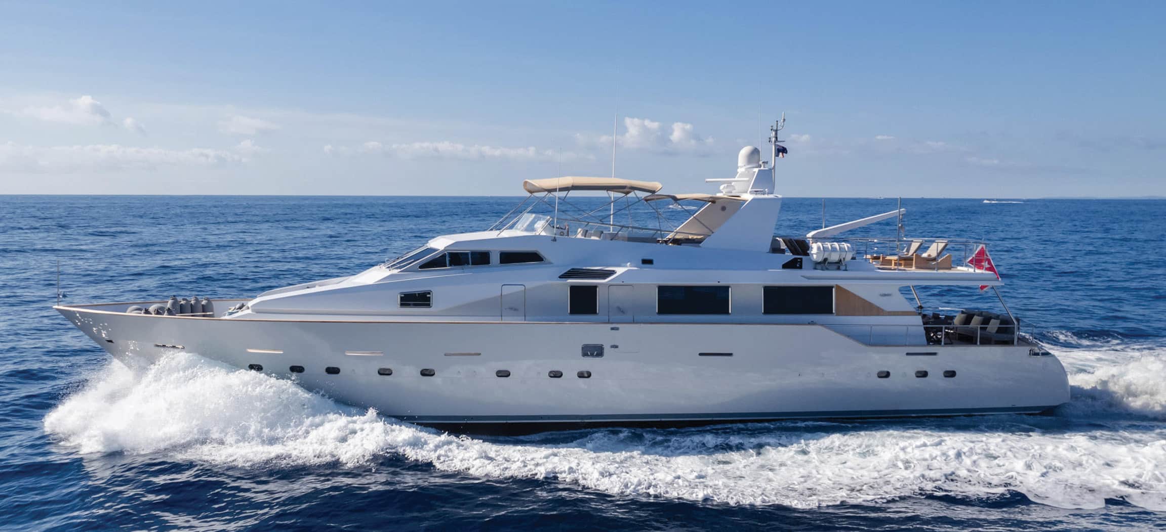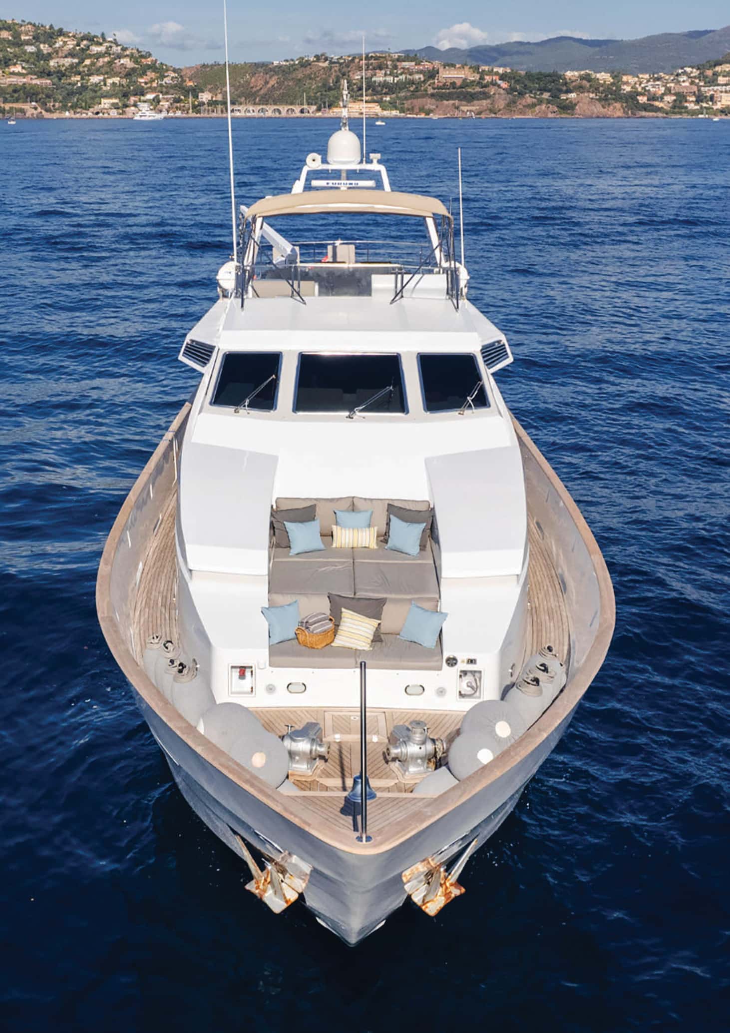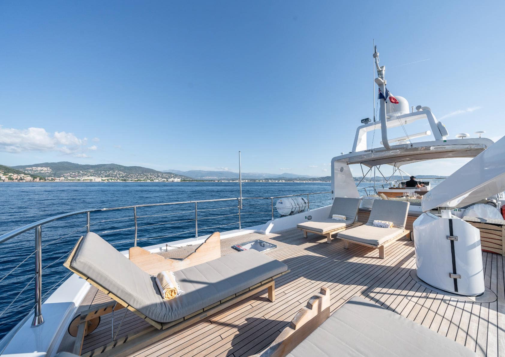 The yacht features wide open decks for socializing and relaxation. Its flybridge offers panoramic views and ample seating. Additionally, the upper deck includes generous lounging spaces for sun lovers. Guests can also enjoy the bow area, which provides a perfect spot for photos. The aft deck includes a shaded dining area for casual gatherings. Every outdoor section feels inviting and spacious.