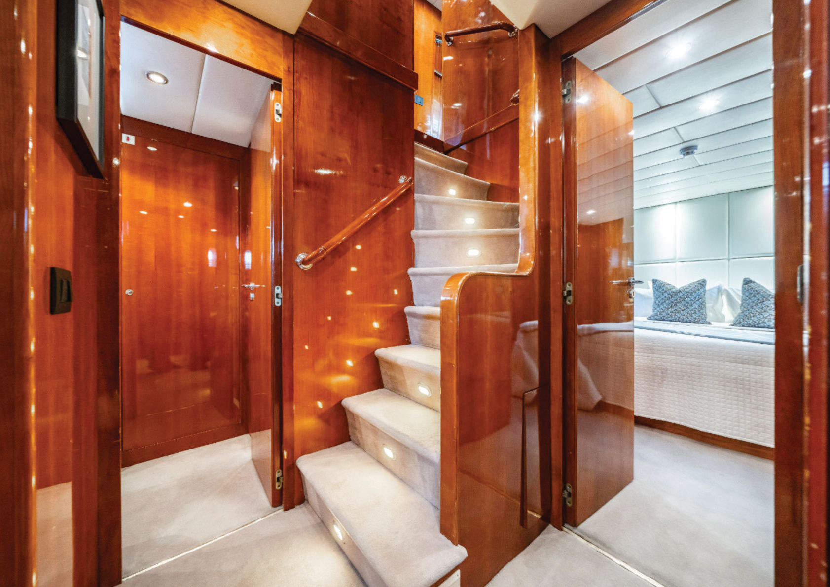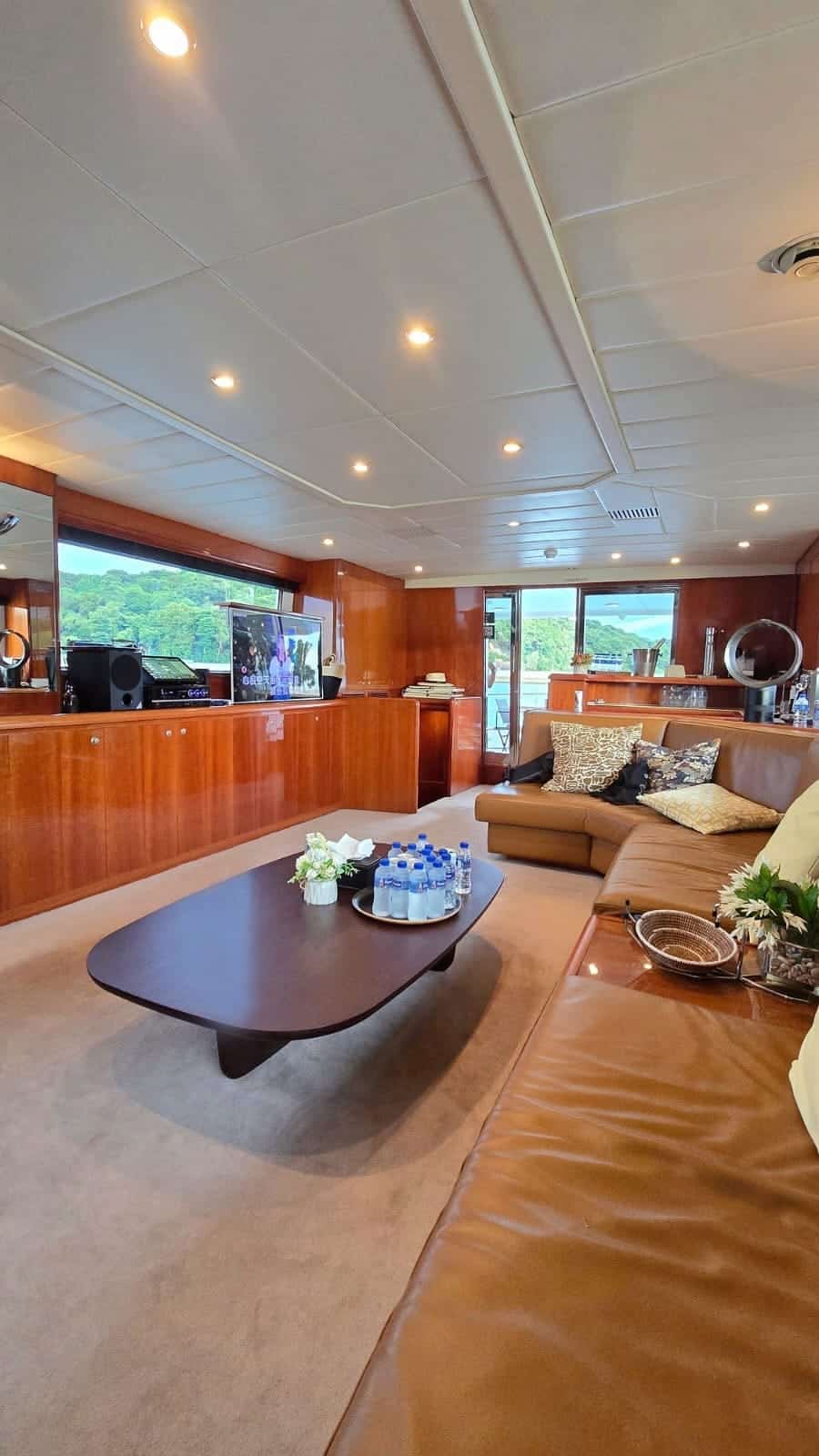 Island B boasts a beautifully crafted interior with modern finishes. The salon offers plush seating and stylish accents. Furthermore, the large windows bring in abundant natural light. Guests can enjoy a warm and welcoming environment throughout the yacht. The salon connects smoothly to the aft deck, supporting seamless movement onboard. The interior layout makes gatherings comfortable and enjoyable.