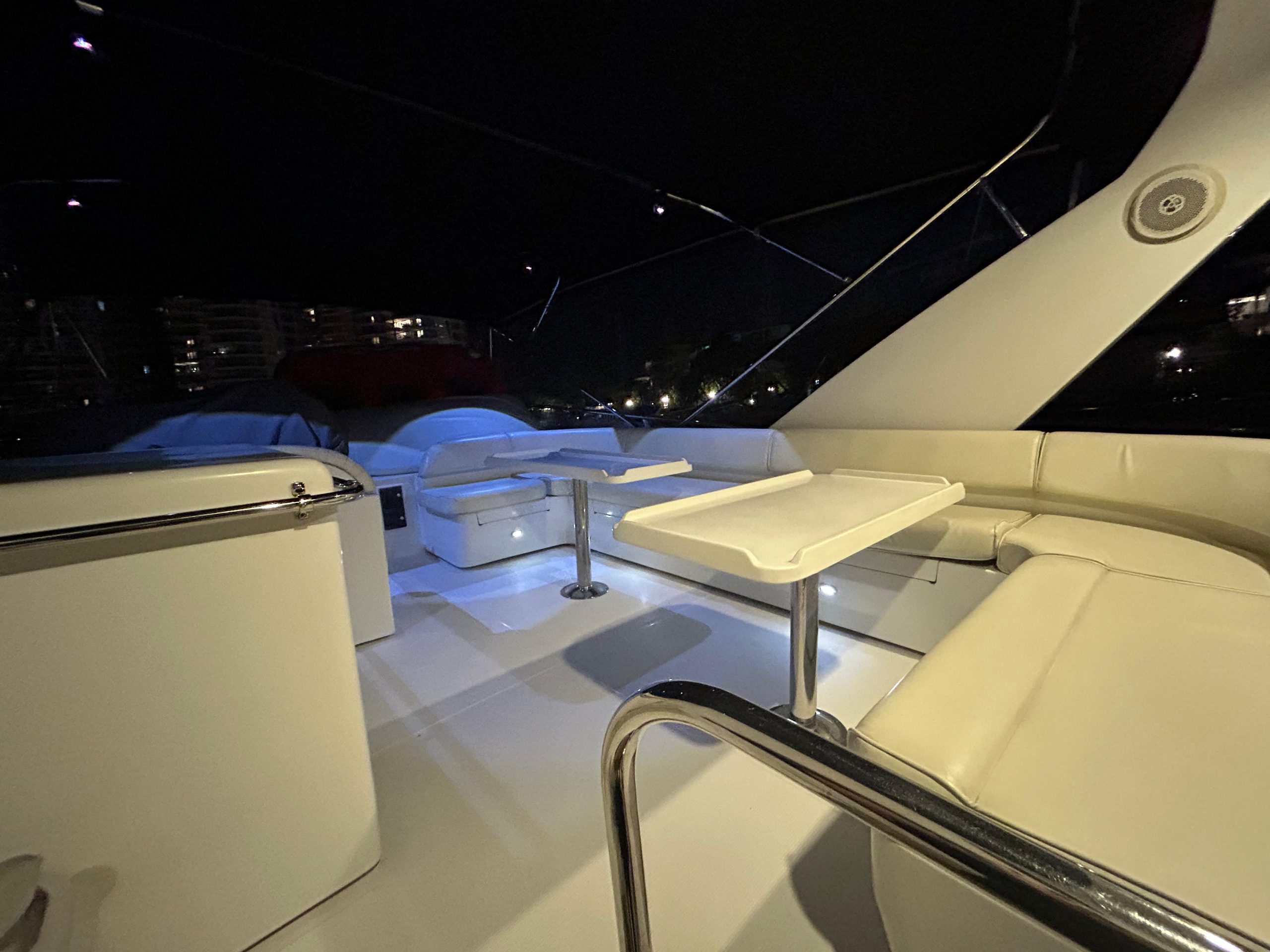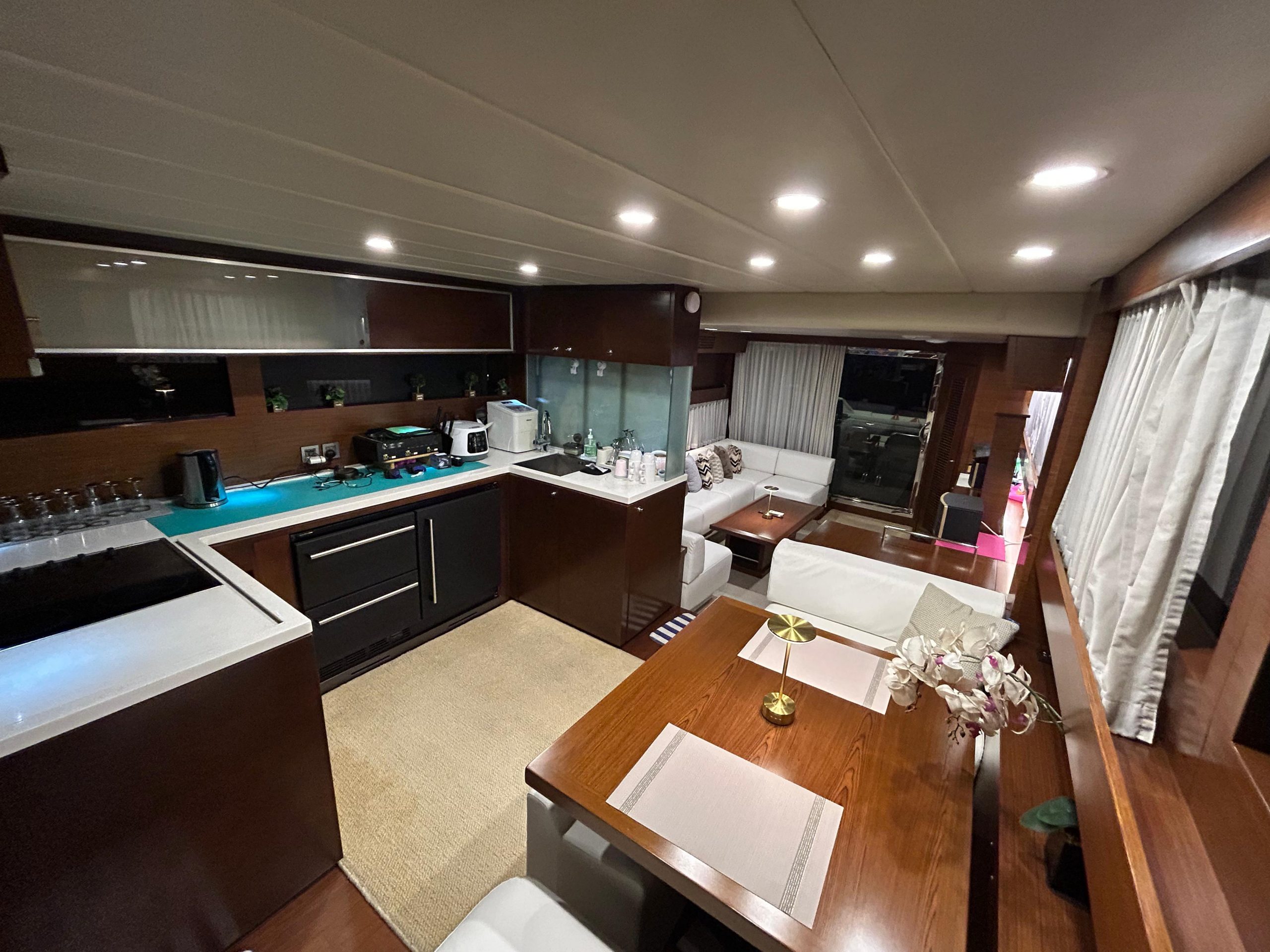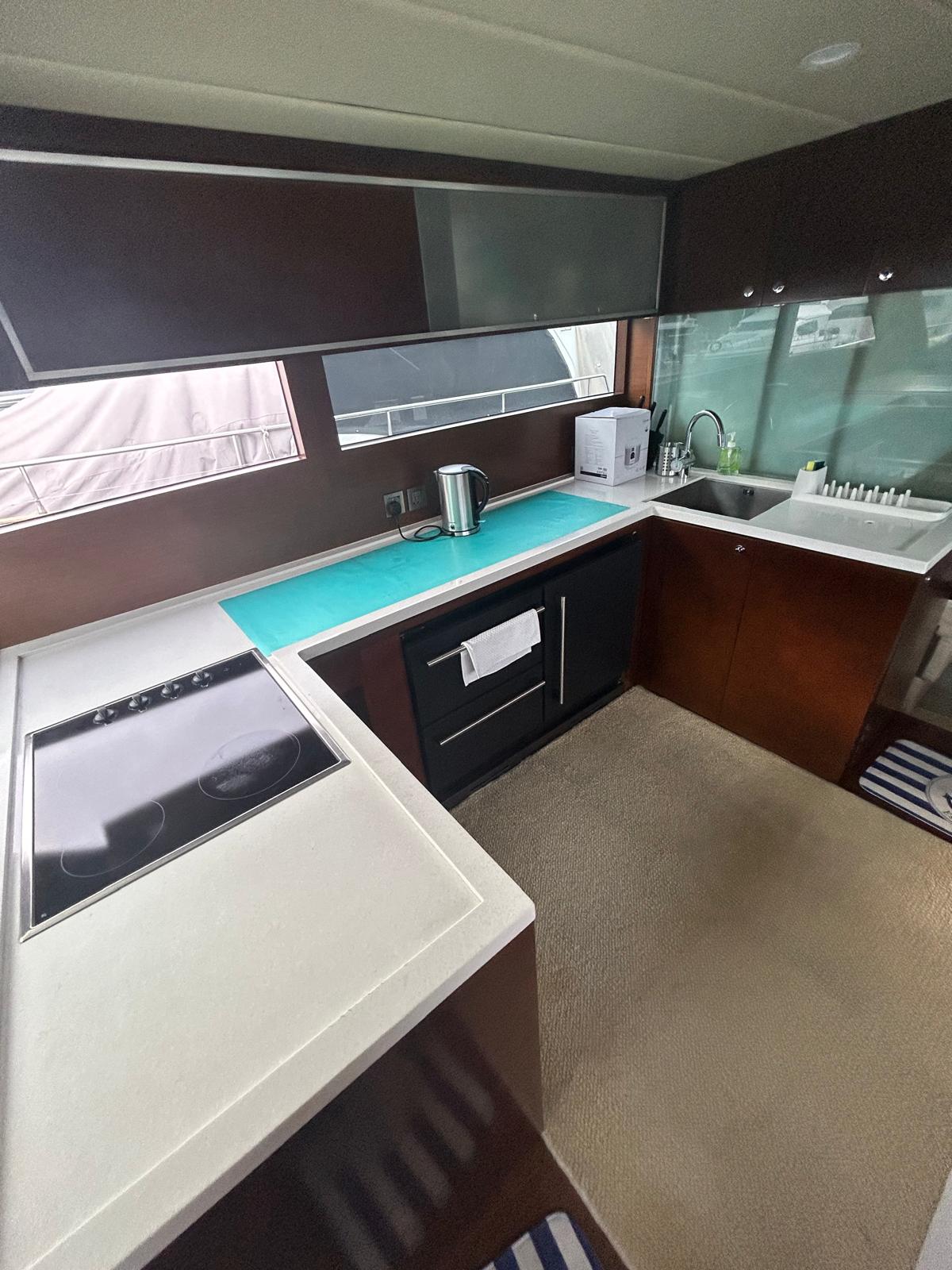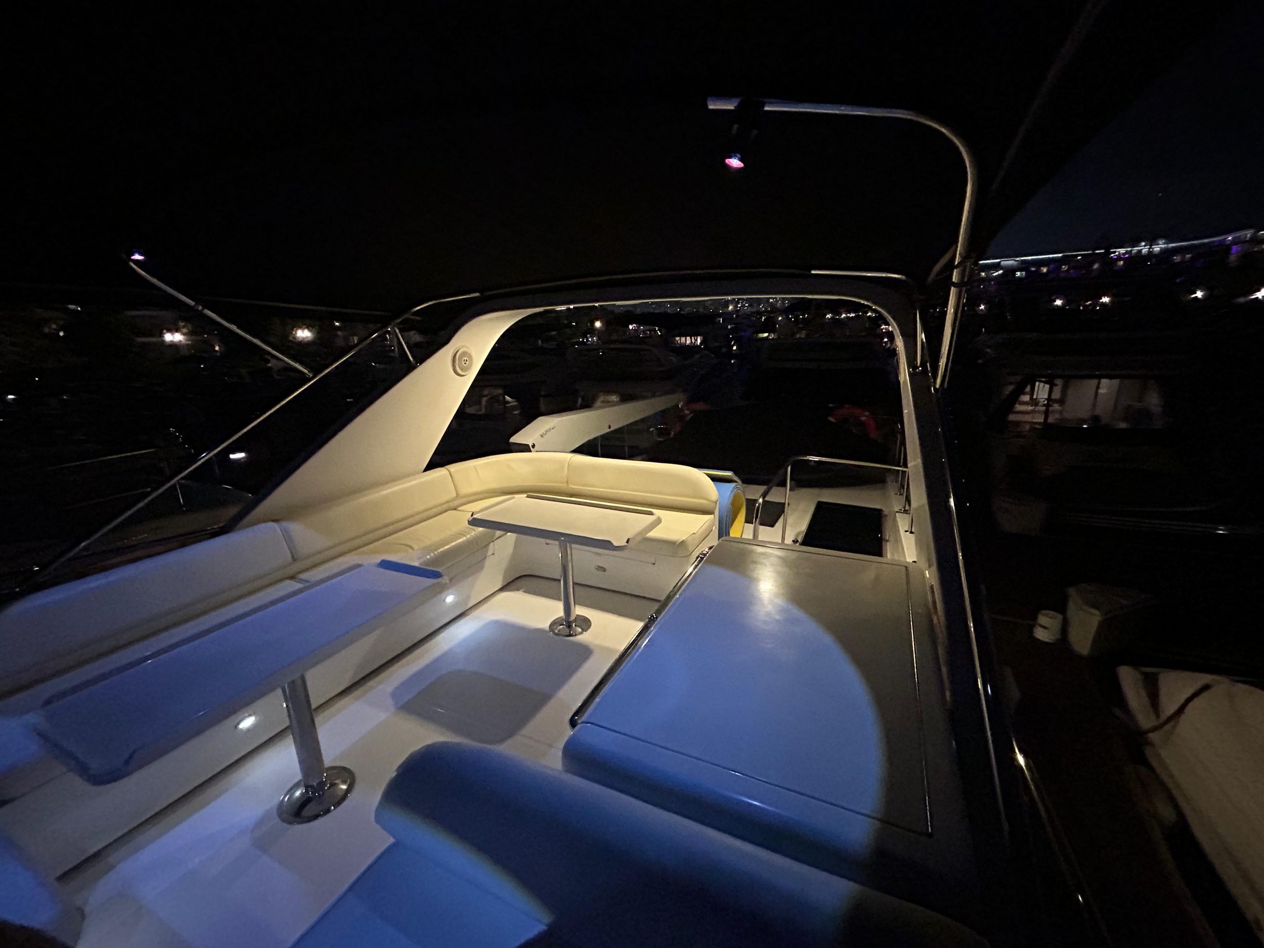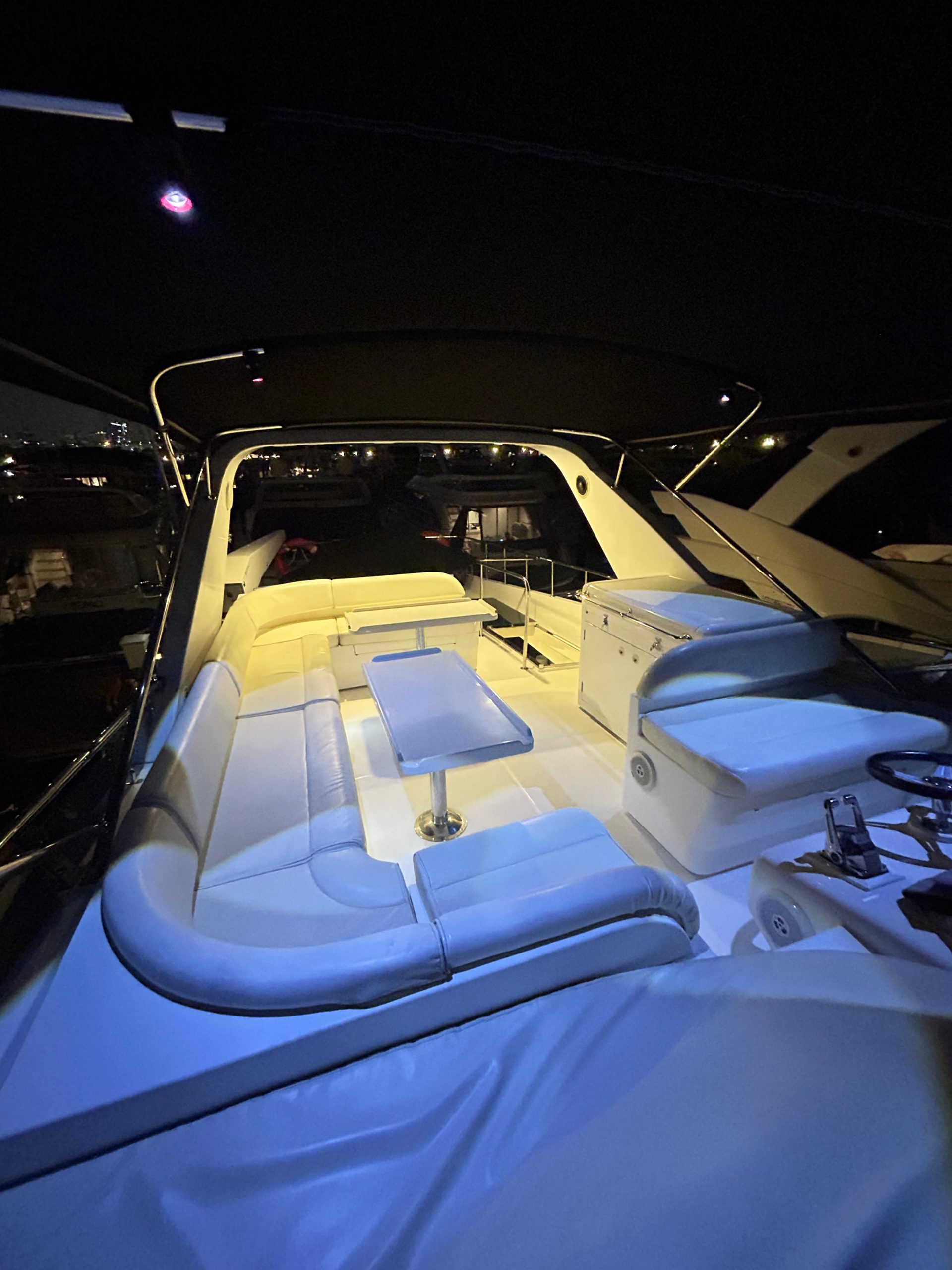 Step into the indoor lounge, equipped with a Karaoke system, microphone, TV, and sofa seating. It’s perfect for entertaining friends and family while cruising. The comfortable setup encourages laughter, music, and lasting memories. Guests can also enjoy the galley, which includes a kitchen top, fridge, and freezer, making it convenient to prepare light snacks or drinks during the trip.